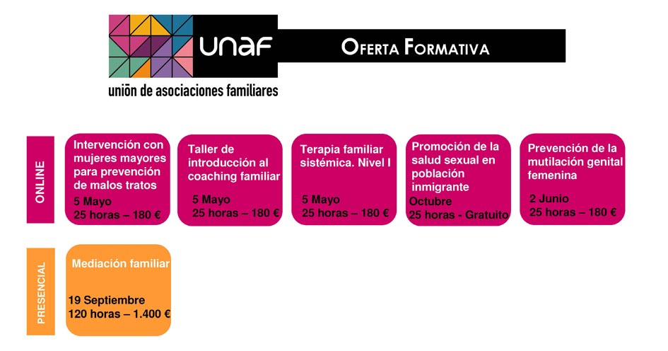 UNAF sigue apostando por la formación continua a profesionales para mejorar la calidad de intervención con las familias y responder a sus muy diversas necesidades. Coaching familiar, terapia familiar sistémica, intervención con mujeres mayores para promover el buen trato, la promoción de la salud sexual en la población inmigrante y la prevención de la mutilación genital femenina son los cursos que UNAF ofrece en los próximos meses.